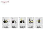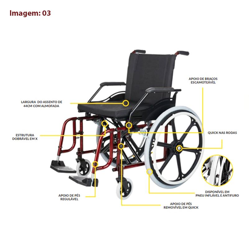 - Freios bilaterais com regulagem, aro impulsor bilateral em nylon reforçado com 8 pontos de fixação;